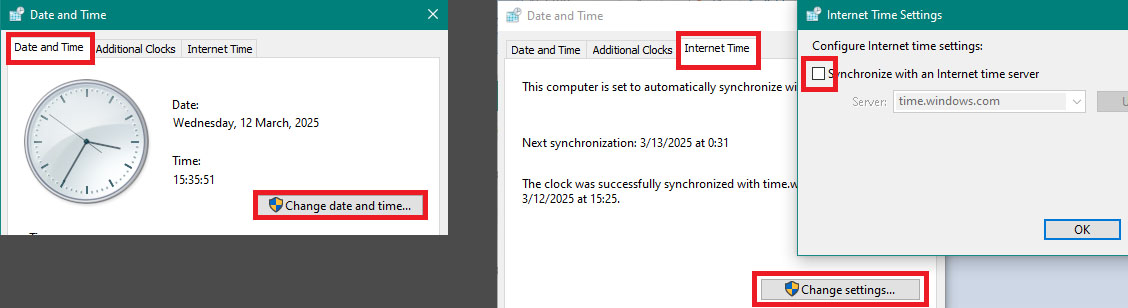 To fix this, you must first set the system date to anything prior to 14 March 2025. I recommend that you also disable internet time sync on your OS to prevent the changed time from reverting. On Windows, this looks like the following: